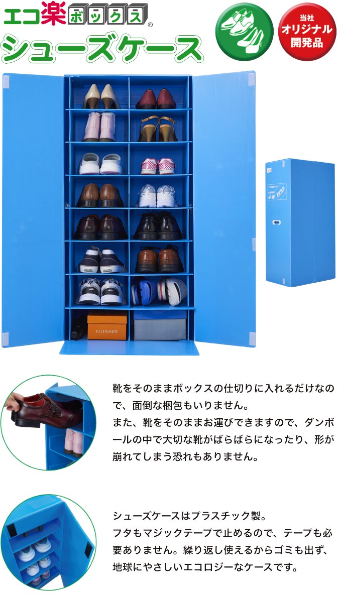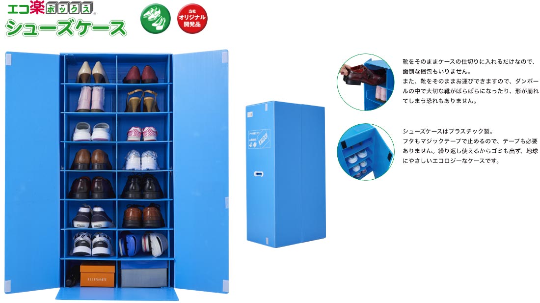当社では、面倒な靴の梱包が簡単にできる「エコ楽ボックス シューズケース」をオリジナルで開発いたしました。